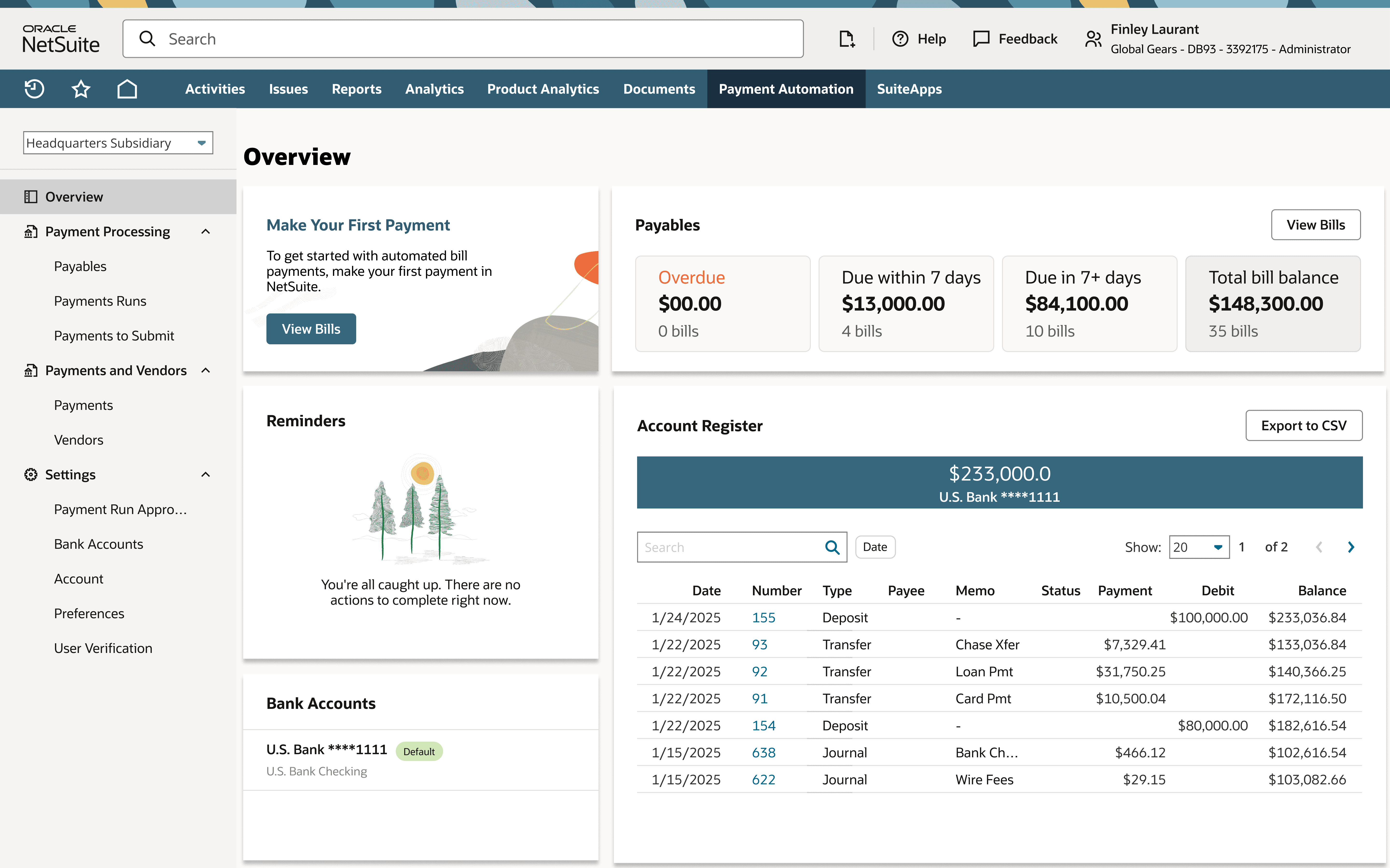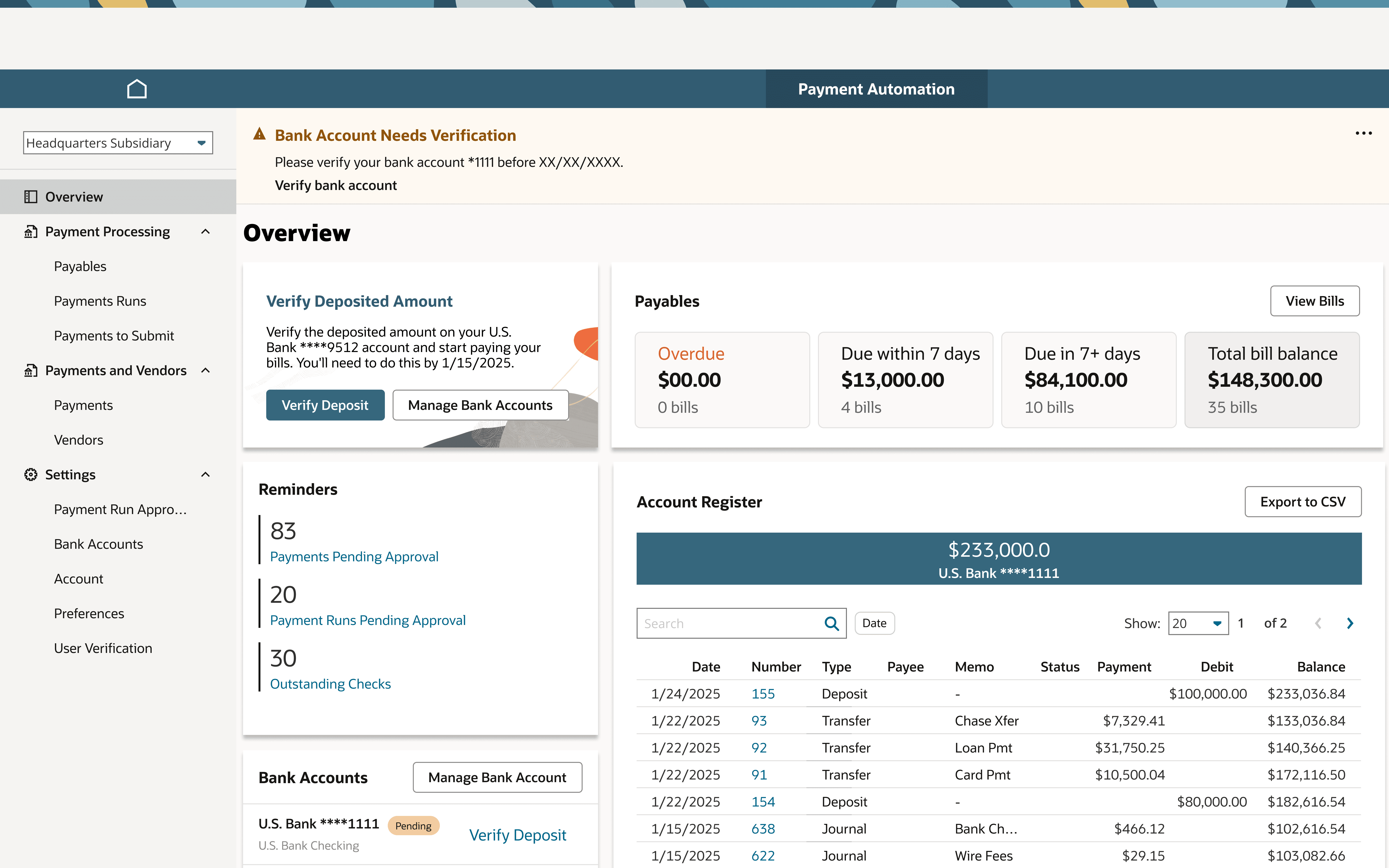 A reimagined payment dashboard provides insight into what needs to be done through recommended action and reminders portlets. In addition, there is a focus on the relevant elements of payment: payable balances, account register, and bank account connectivity.