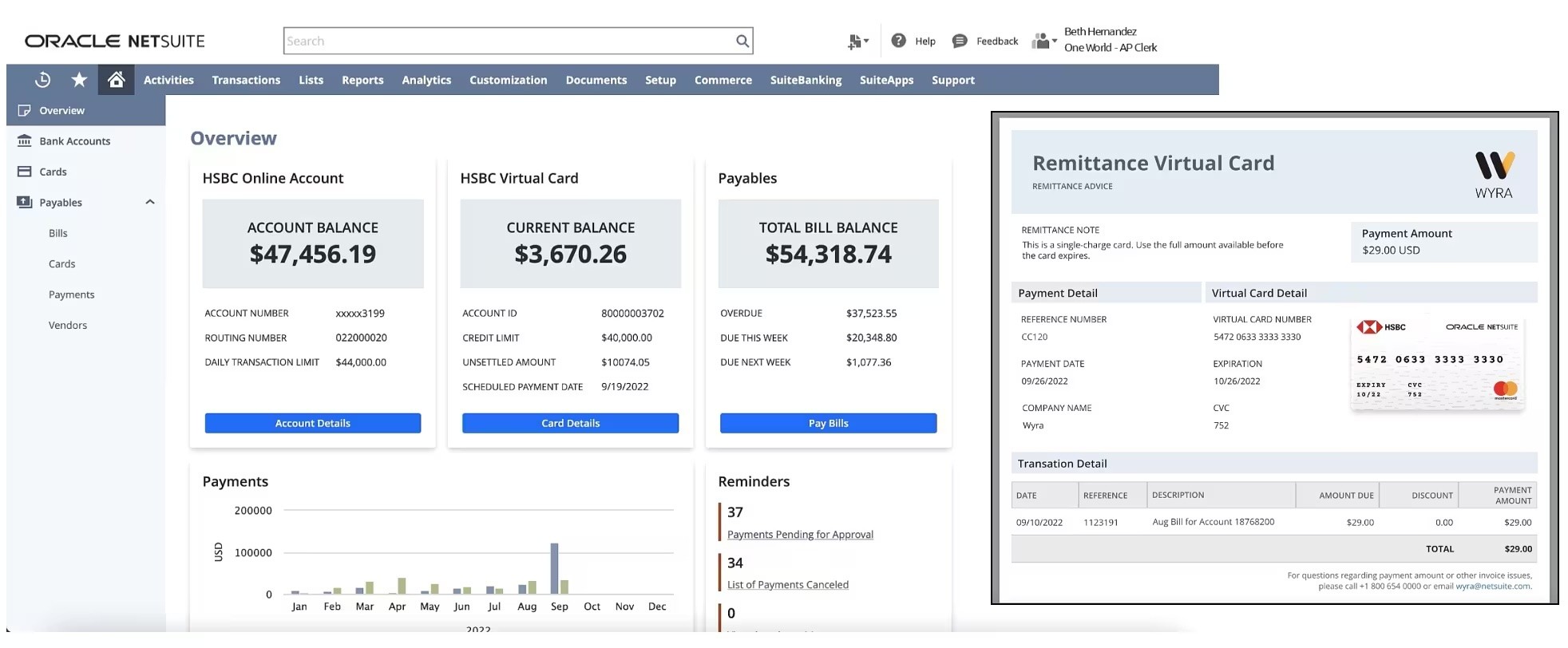 For example, relevant bank details can be accessed and managed through the side panel without the user being redirected to another place in NetSuite.