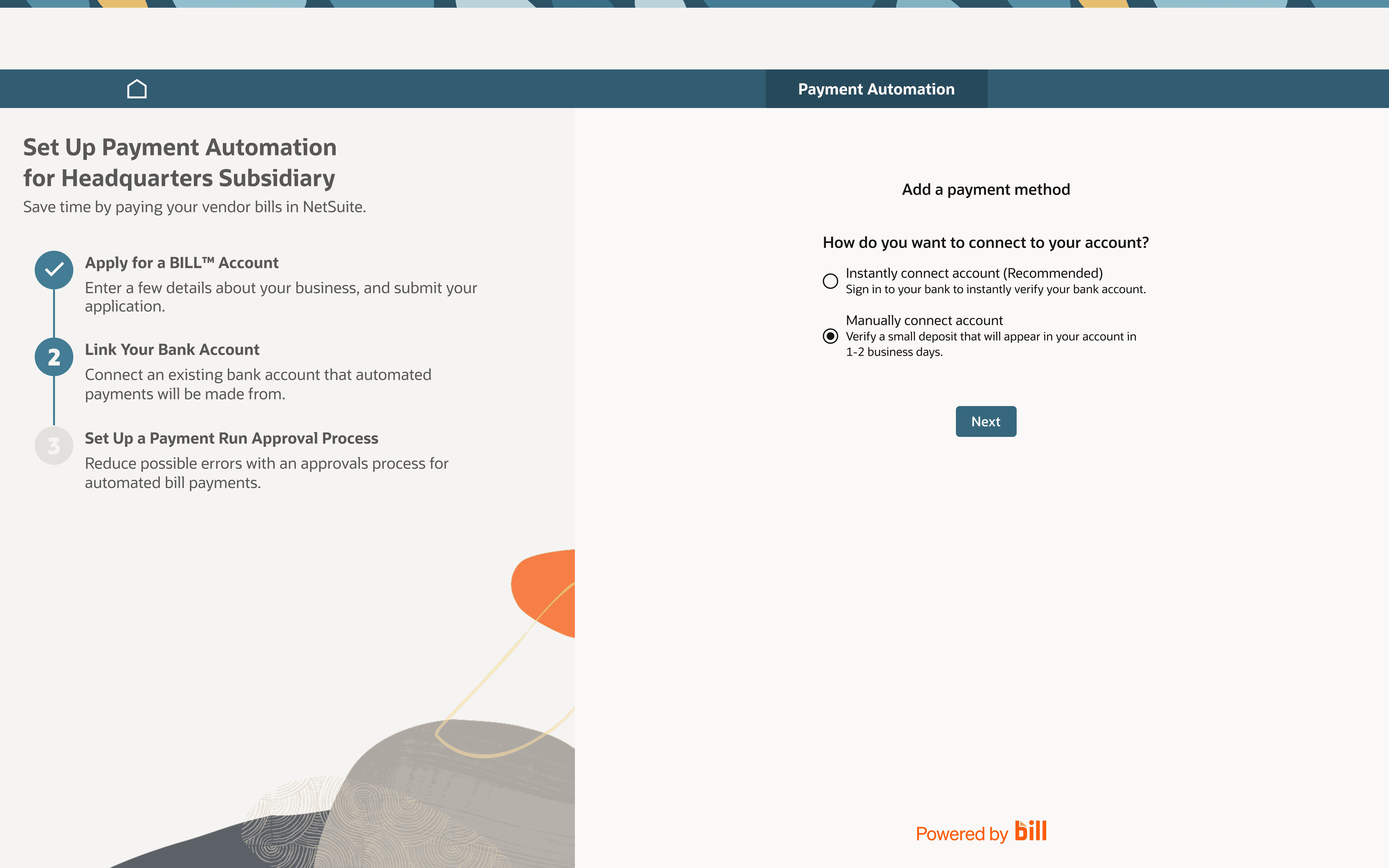 When a new partnership with BILL.com was announced, it introduced both an opportunity and a challenge. BILL.com is a financial operations platform that handles the secure payment processing layer, acting as the engine that moves money from a company's bank account to their vendors. Because BILL.com operates as a separate service, users would step outside of NetSuite to complete certain payment actions, creating a fragmented experience at a critical moment in the workflow.